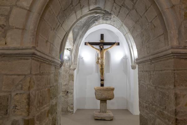 De origen románico y propiedad templaria, sólo conserva de esta primera versión del siglo XII la nave central y los canecillos. Las naves laterales son góticas, del siglo XIV. Sin embargo, el lugar más visitado tiene factura posterior. La capilla barroca del Santo Cristo, edificada en 1730, alberga el crucifijo que San Vicente Ferrer donó a Graus en 1415. La imagen original se quemó en parte durante la Guerra Civil, y fue restaurada a finales de los años cuarenta.